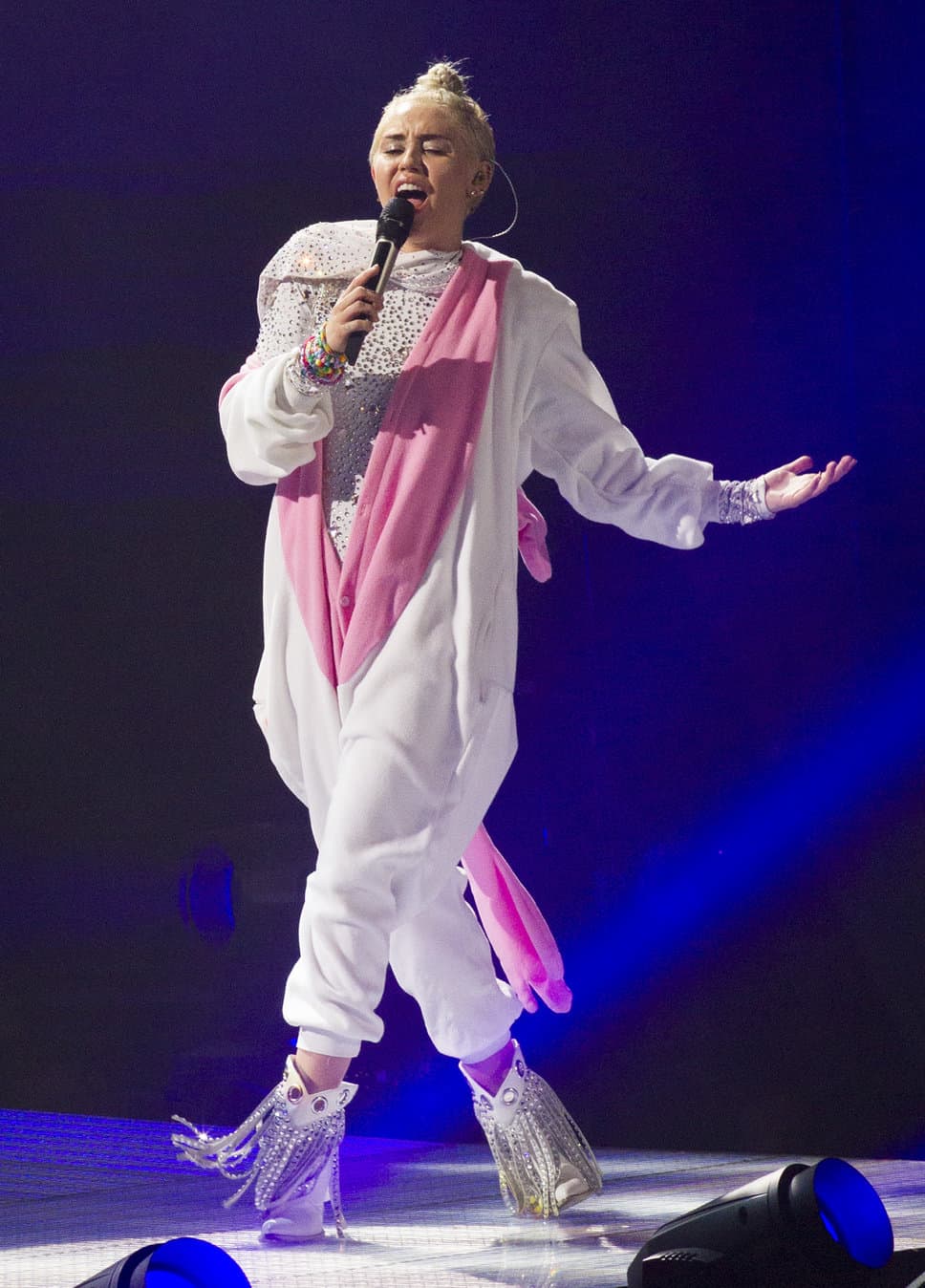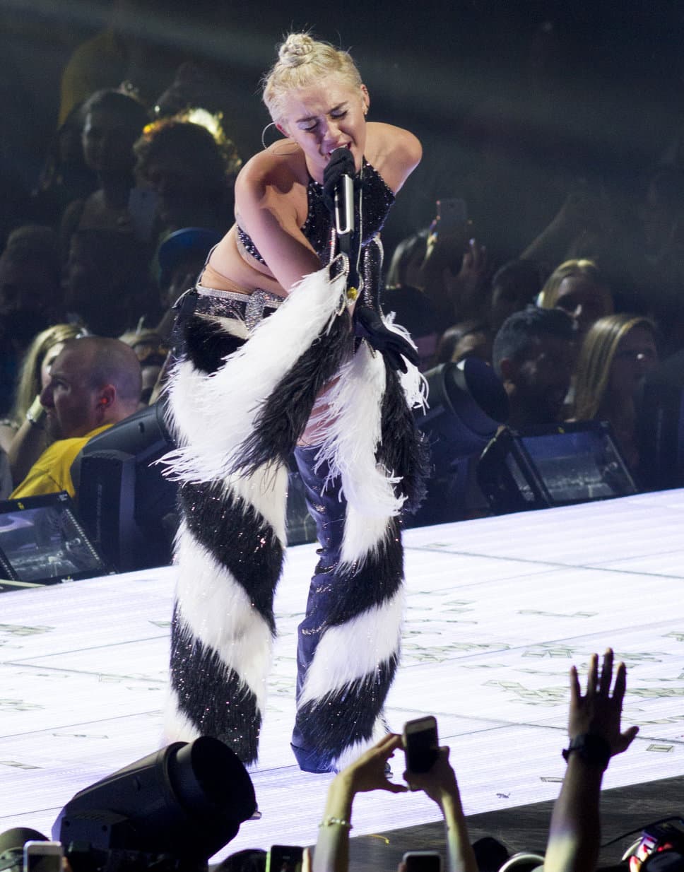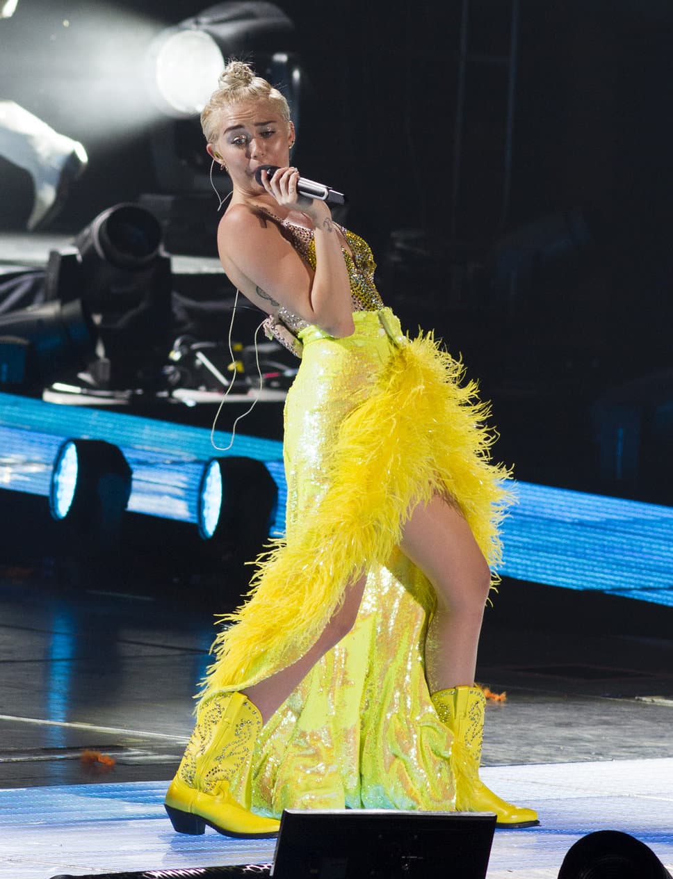 Mlada pevačica, koja voli da pokazuje jezik, ne skriva ni svoje druge atribute, ali zaboravila ni svoje kantri korene, pa tokom celog koncerta nosi kaubojske čizme. A što se ostatka tela tiče, tu je kostim zeca, kao i onaj napravljen od fotografija novca, sa ogrlicom od marihuane.
