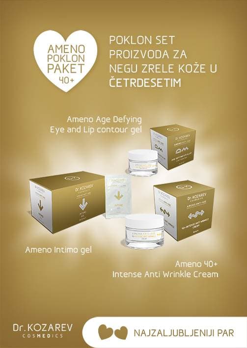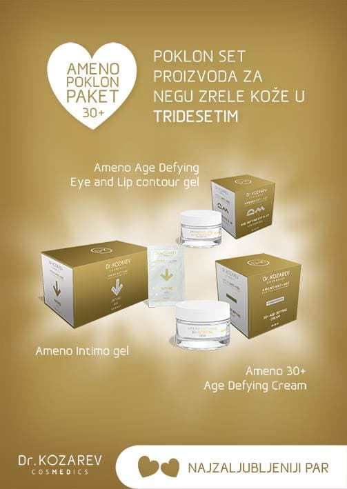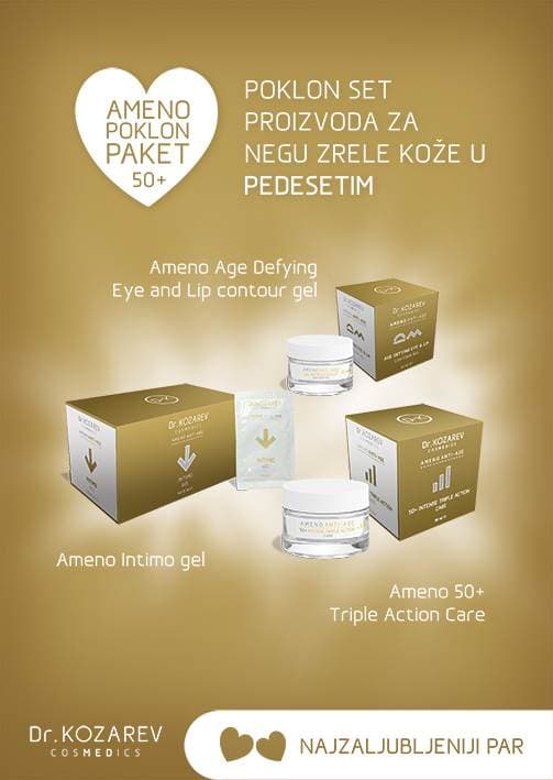 2. AMENO poklon paket – poklon set proizvoda za negu zrele kože u tridesetim (Ameno 30+ Age Defying Cream, Ameno Age Defying Eye and Lip contour gel, Ameno Intimo gel), četrdesetim (Ameno 40+ Intense Anti Wrinkle Cream, Ameno Age Defying Eye and Lip contour gel, Ameno intimo gel) i pedesetim godinama (Ameno 50+ Triple Action Care, Ameno Triple Action Eye and Lip contour gel, Ameno Intimo gel)
